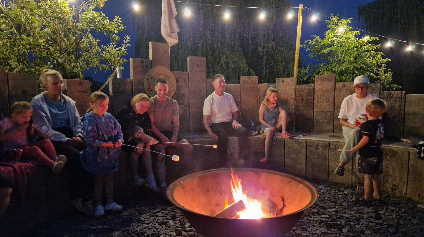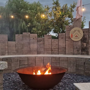 At the heart of Aldwark Bridge Glamping is our pièce de résistance – the fire pit, a place where laughter and conversations flow, music drifts into the night, and friendships spark as easily as the flames. Built from the weathered timbers of the old bridge and nestled beside the charming, historic toll bridge itself, this unique spot blends heritage with warmth. The grand stone seating curves generously around the fire, comfortably welcoming 25–30 people, making it perfect for big family gatherings, groups of friends, or even a whole site of guests coming together. The perfect setting to share stories, food, and toasted marshmallows. As the embers glow, guests can snuggle into our soft, cosy cushions and wrap themselves in thick, warm blankets – the perfect setting to sip, chat, and lose track of time under the stars.